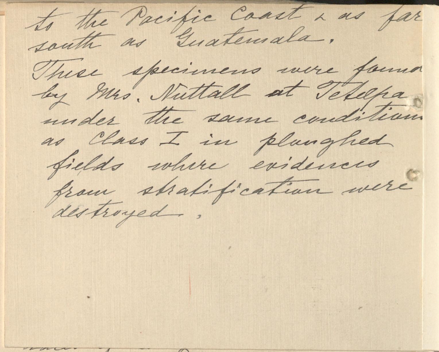 Photographs of the excavations and the stratum in which these speciemens were found will be sent by Mrs. Nuttall.