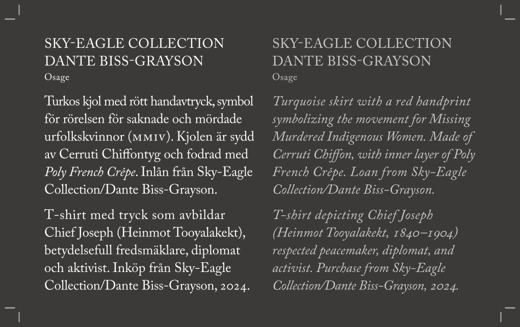 SKY-EAGLE COLLECTION DANTE BISS-GRAYSON Osage Turkos kjol med rött handavtryck, symbol för rörelsen för saknade och mördade urfolkskvinnor (MMIV). Kjolen är sydd av Cerruti Chiffontyg och fodrad med Poly French Crêpe. Inlån från Sky-Eagle Collection/Dante Biss-Grayson. T-shirt med tryck som avbildar Chief Joseph (Heinmot Tooyalakekt), betydelsefull fredsmäklare, diplomat och aktivist. Inköp från Sky-Eagle Collection/Dante Biss-Grayson, 2024.