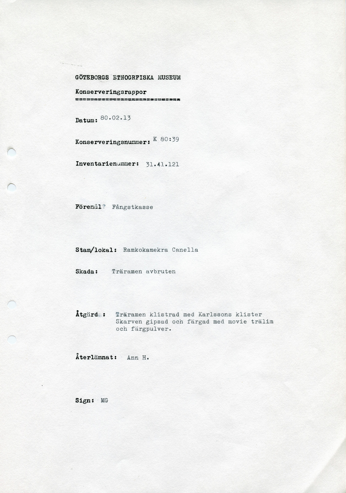 • Konserveringsrapport, Göteborg etnografiska museum (GEM).