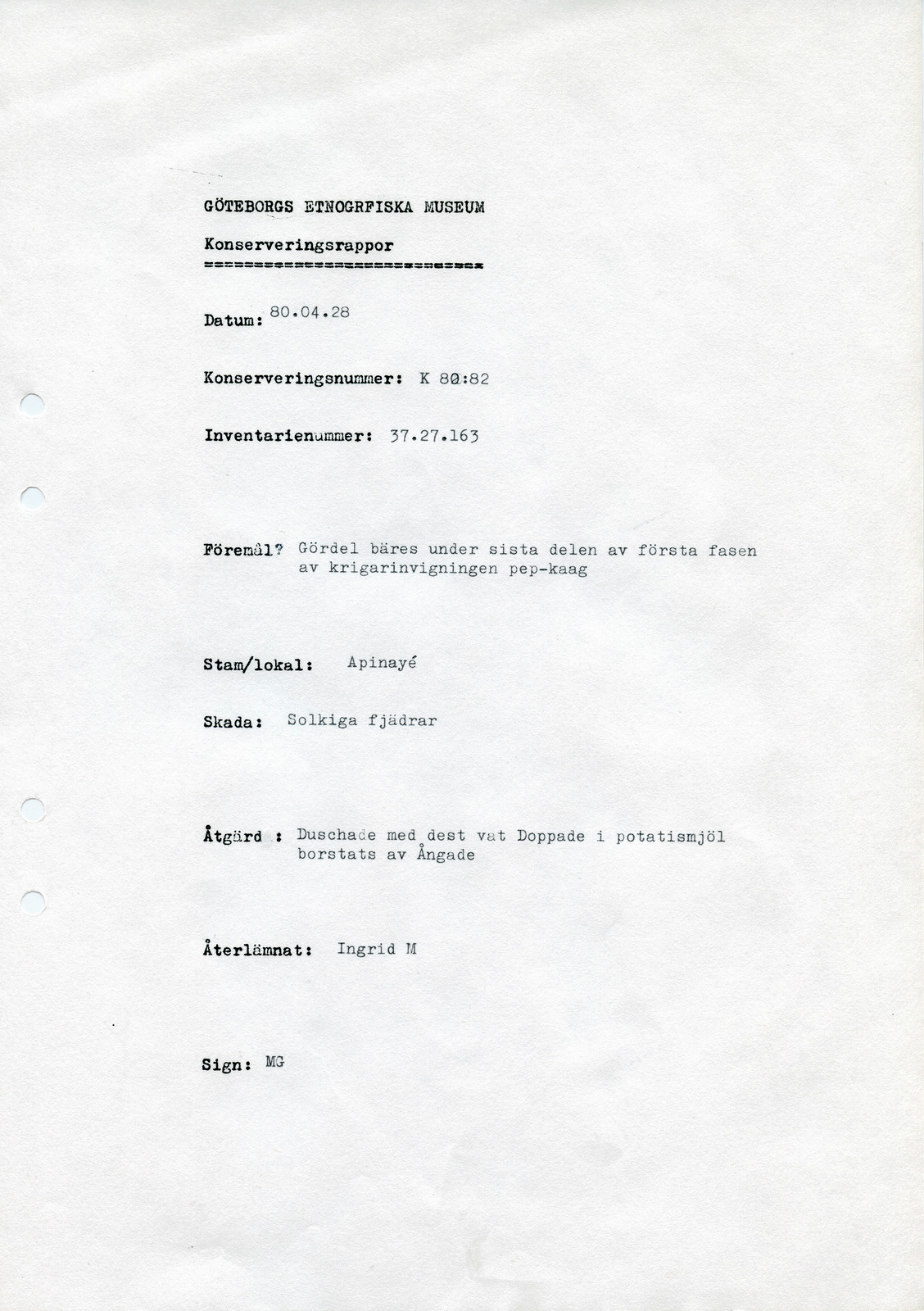 • Konserveringsrapport, Göteborg etnografiska museum (GEM).