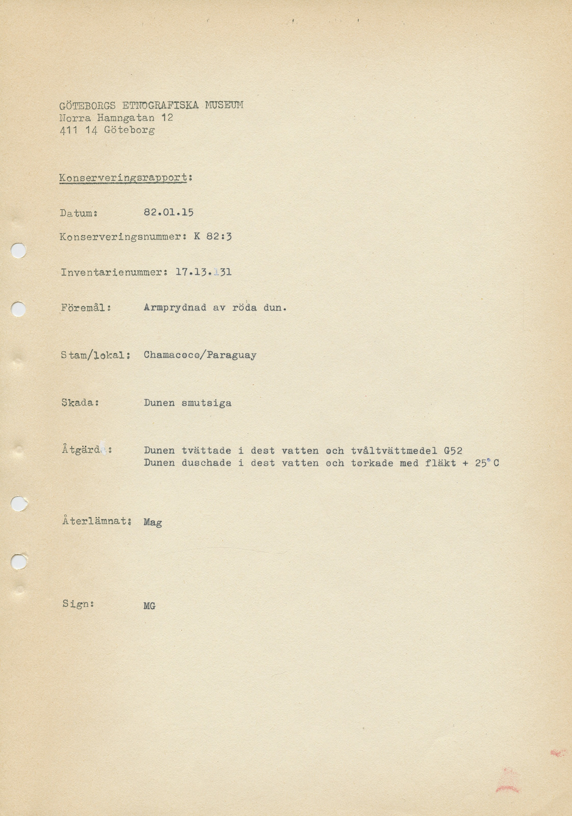 • Konserveringsrapport, Göteborg etnografiska museum (GEM).