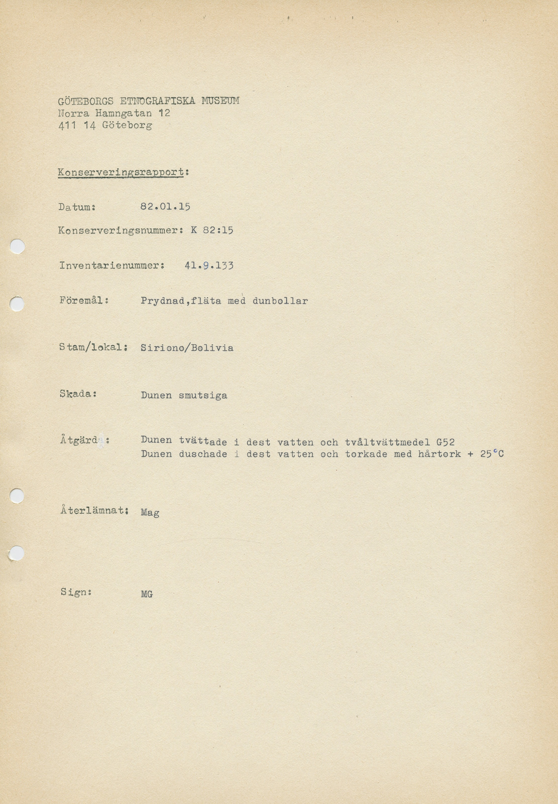 • Konserveringsrapport, Göteborg etnografiska museum (GEM).