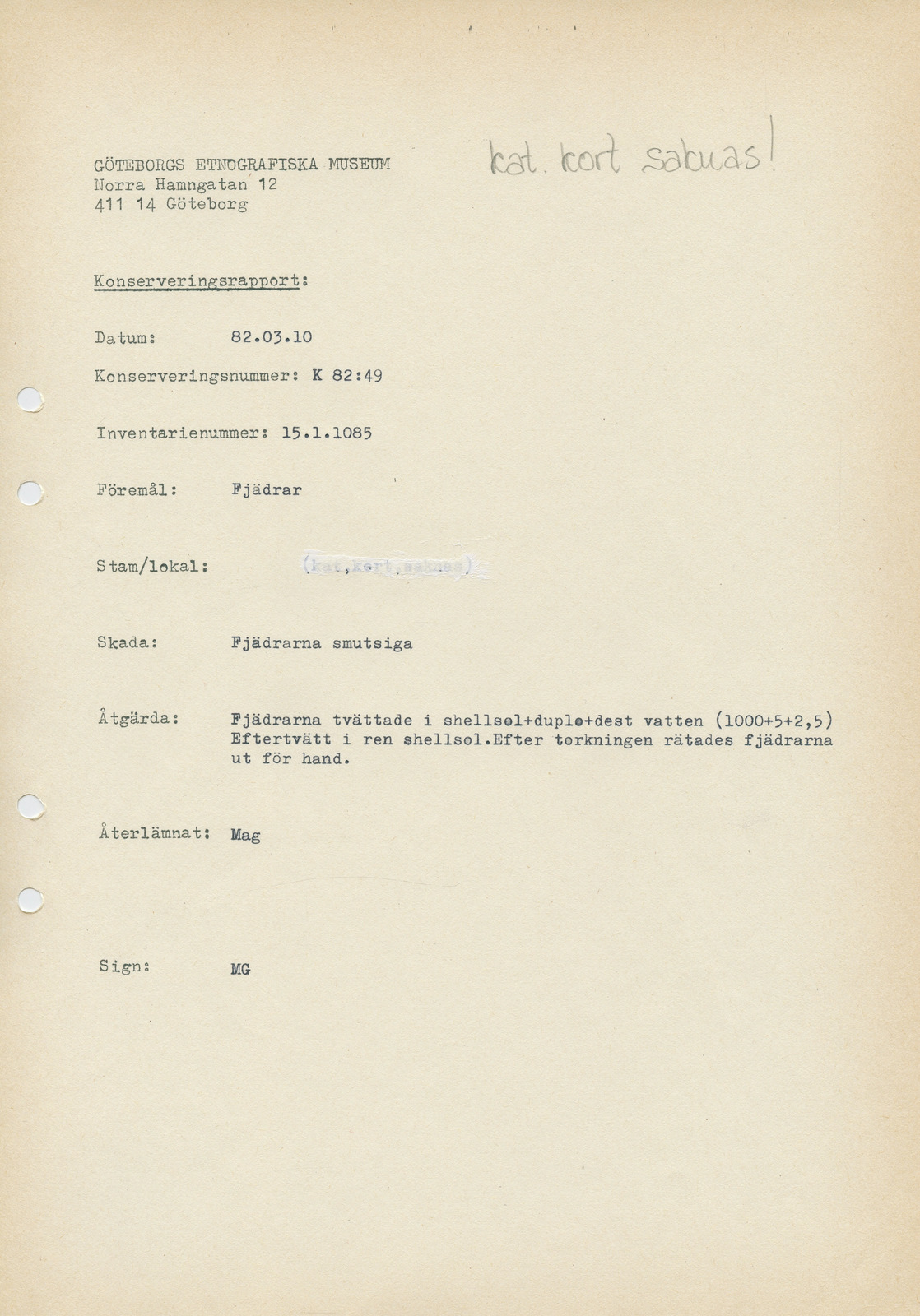 • Konserveringsrapport, Göteborg etnografiska museum (GEM).