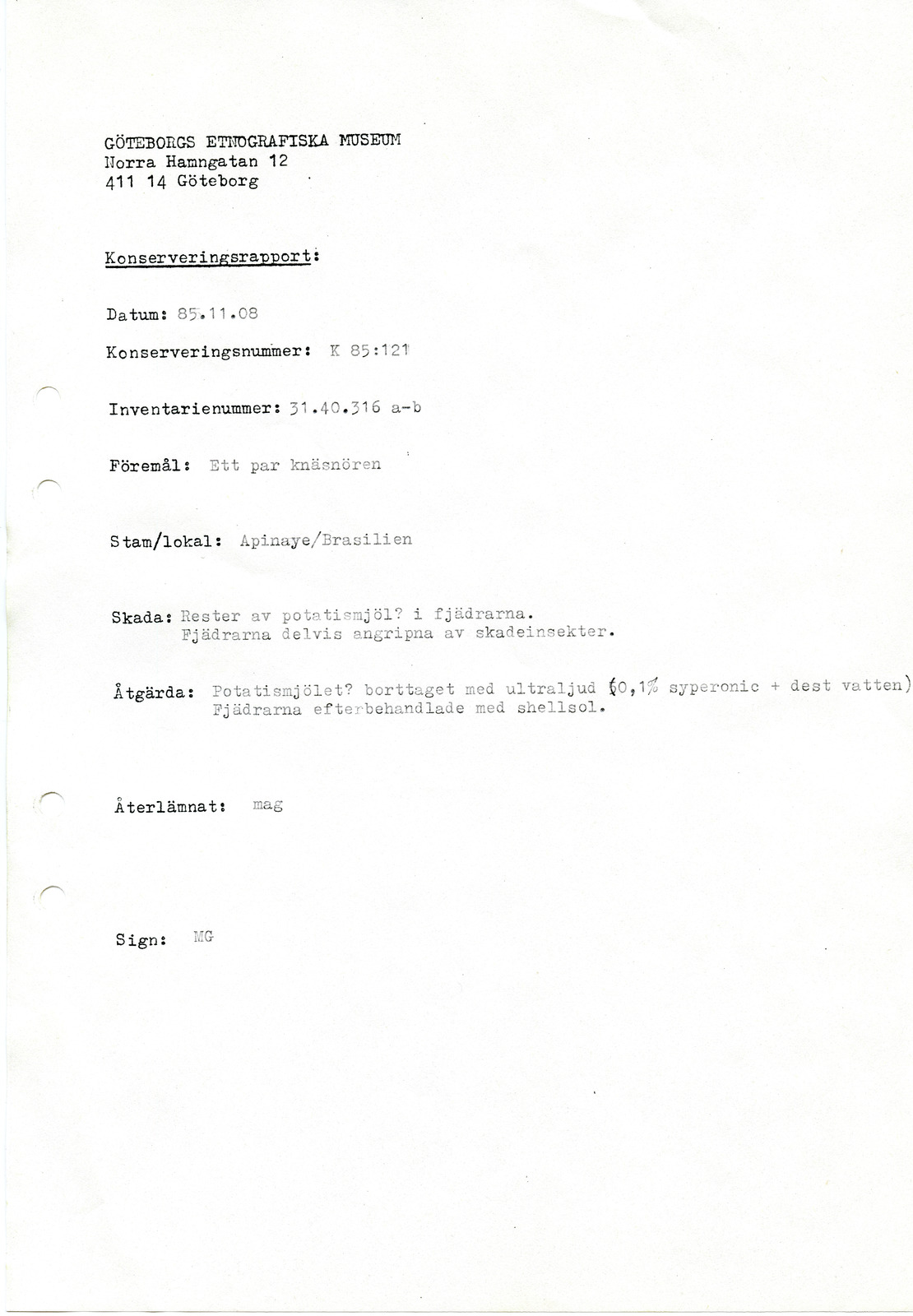 • Konserveringsrapport, Göteborg etnografiska museum (GEM).