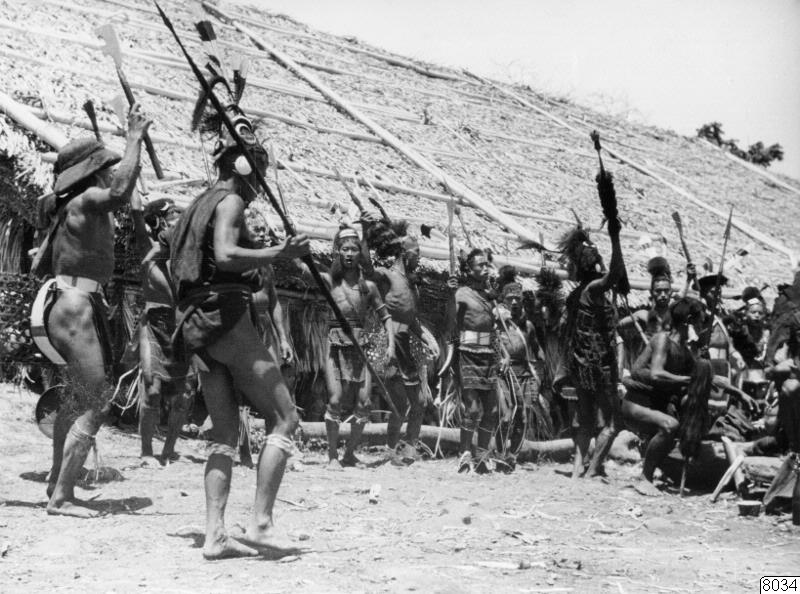 Motiv: Det vilda slutet av slutskedet vid slutet av segerdansen efter en lyckad expedition för inbringande av ett fiendehuvud. Mannen t.v. bär en gammal tropikhjälm. Lokal: Wakching, Naga Hills District, Assam. Foto: Dr. H.E. Kauffmann (Schweiz), 1937. ERh: av dito enligt brev av, 18.8.1943. (katalogkort)