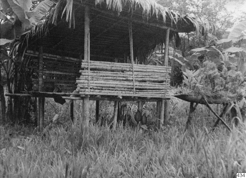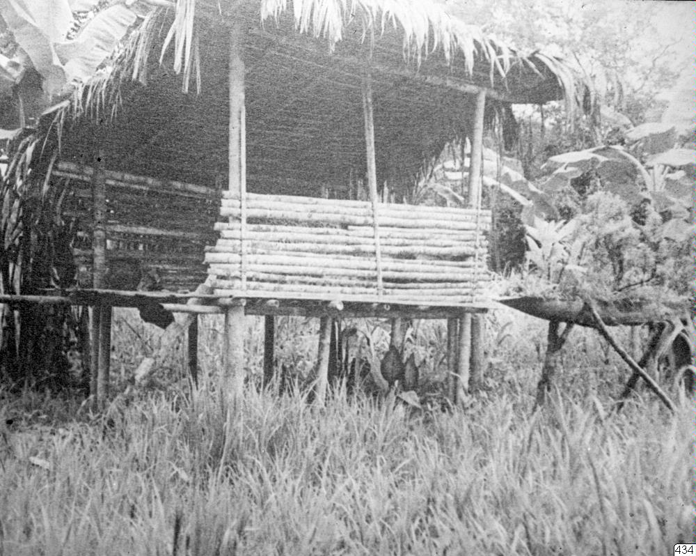 Majslada på stolpar samt stolpuppställd gammal kanot för örtodling. Se H. Wassén: Notes on Southern Groups, etc. ES 1, Göteborg 1935, fig. 37. Bildark: (förstoring) 434. Neg. nr: för sk. 3499.