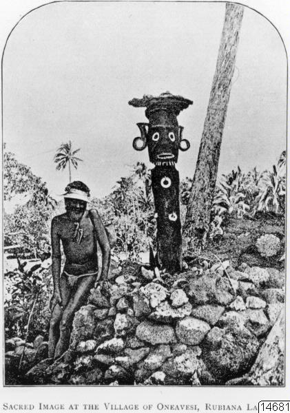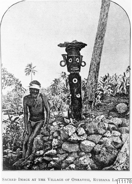 Helig träfigur från byn Oneavesi. Lokal: Rubiana Lagoon, Salomonöarna, Melanesien. Foto: Fotograf okänd, datum okänd. Publ. Charles Morris Woodford: A Naturalist smong the Head-Hunters being an Account of three visits to the Salomon Islands in the years 1886, 1889, and 1888. Melbourne an Sydney 1890. Figs. vid p.150 och 152. (katalogkort). New Georgia: Rubiana Lagoon: Onavesi.