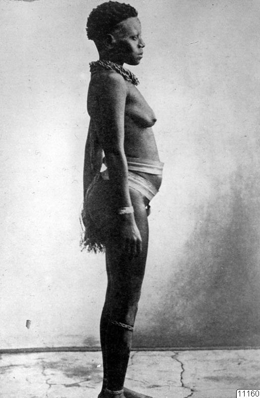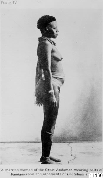 Motiv: Gift kvinna från Stor-Andamanerna med bälte av pandanus-blad och prydnader av dentalium-snäckor; Lokal: Andamanerna. Foto för skioptikon, erh. gm. köp av Dr. W. Kauderns bildmaterial, 1947. Publ. A.R. Brown: The Andaman Islanders. Cambridge 1922, pl. IV, V. (katalogkort)
