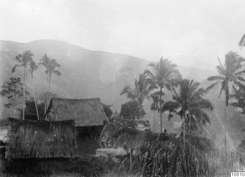 Motiv: Byn Biro, husbild (det stora huset något t.v. är lobon, bytemplet). Lokal: Tobakoe, Central-Celebes. Foto av Walter Kaudern, okt 1918, erhållen gm. köp av Kauderns negativmaterial, 1947. Publ. W. Kaudern: Ethnographical Studies in Celebes, Vol. I, fig. 15, Gbg 1925. (katalogkort)