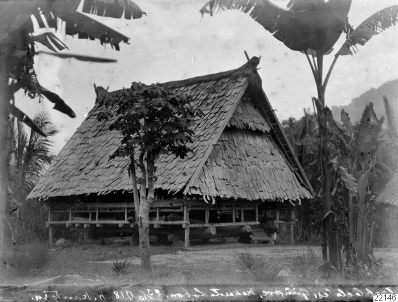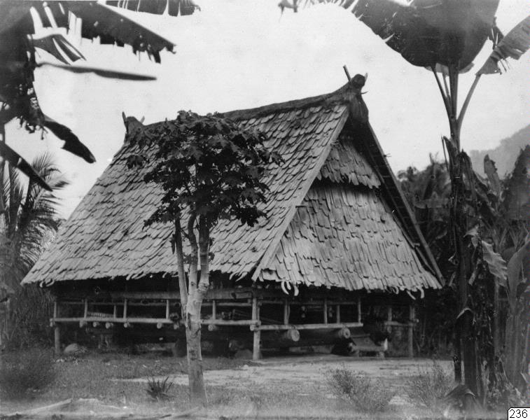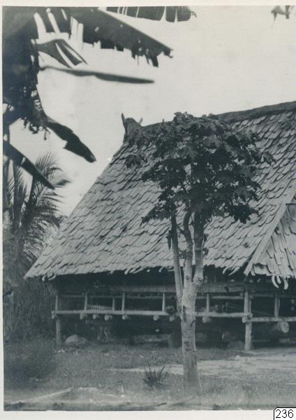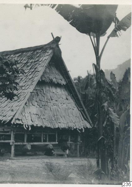 Motiv: Templet (lobo) i Gimpoe. Jfr. bildnr. 236=först. av samma motiv. Lokal: Gimpoe, Central-Celebes. Foto av Walter Kaudern, 1918 (23/10), erhållen gm. köp av Kauderns bildmaterial, 1947. Publ. W. Kaudern: I Celebes obygder, I, bild 141. Stockholm 1921. Ibid.: Ethn. Stud. in Celebes, I, fig. 98. Gbg. 1925. (katalogkort)