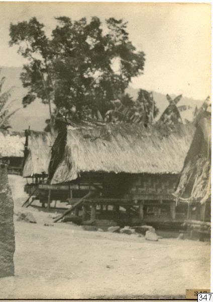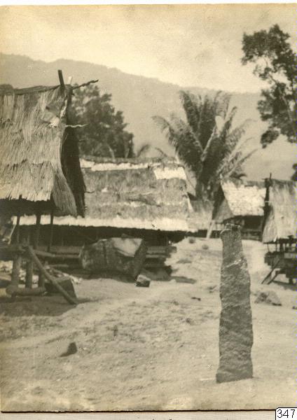 Motiv: Upprättstående sten framför bytemplet (lobon). (bytemplet) i Kantewoe. Lokal: Kantewoe, Central-Celebes. (Mellan-Celebes: Paloe). Foto: Walter Kaudern, okt. 1918. Erh: gm. köp av kauderns negativmaterial, 1947. Publ. W. Kaudern: I Celebes obygder, I, bild 109.Sthlm 1921;IBid:Ethn. Stud.in Celebes, Vol.V, fig.8,gbg. 1938. (katalogkort).