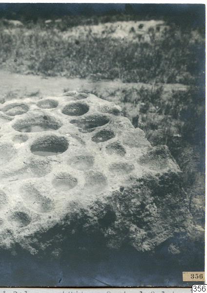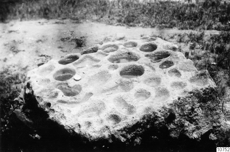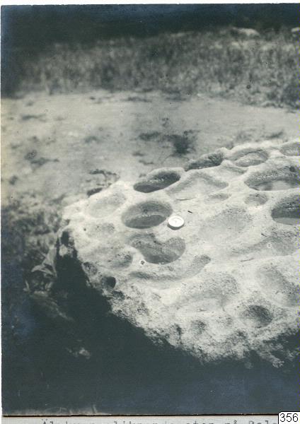Stenblock med gropar. Älvkvarnsliknande sten på Bolapapoehöjden, Koelawi. Byn Panapa. Foto erhållet av fotografen själv, Walter Kaudern, 1922 (katalogkort). Publ. W. Kaudern: I Celebes obygder, II, bild 56. Sthlm.1921