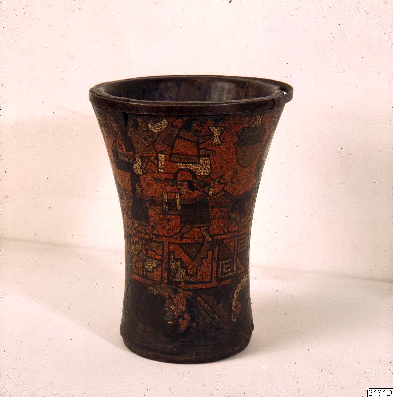 Träbägare, med lackarbete, sk kero -bägare.Höjd: 21 cm.