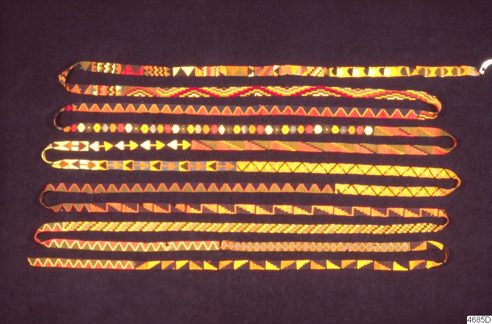 Skärpliknande huvudbonad som har en serie olika motiv samtliga geometriska utom ett som visar en rad bönor. Materialet är bomull i varpen med inslag av ull. Telkniken är gobeläng. Publ. ES.34. Pl. 32 (färg).