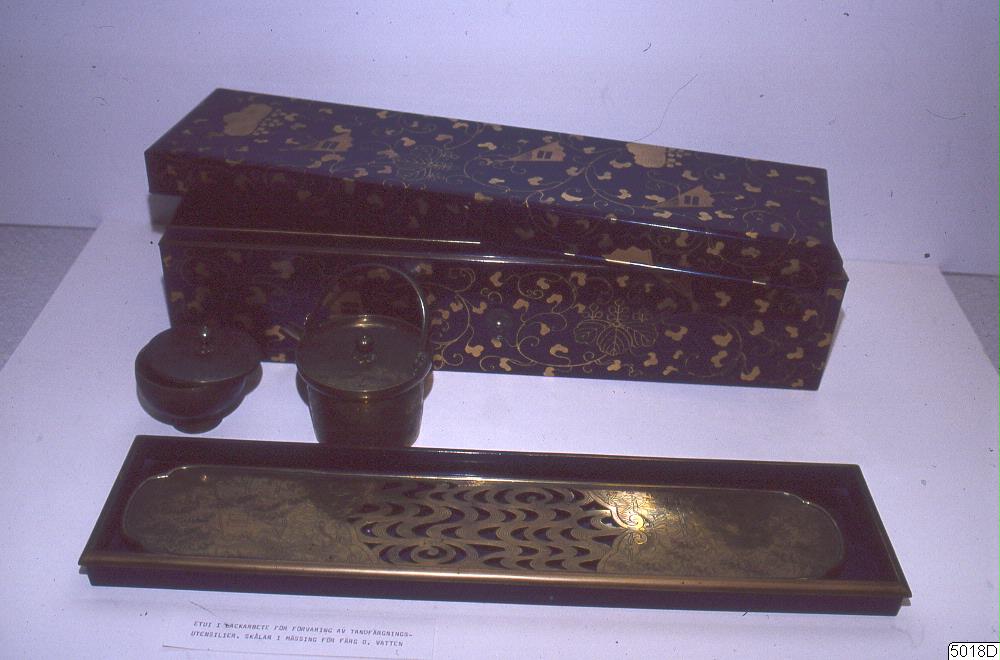 Etui för tandfärgning (i tre delar) innehållande en mindre kittel för vattnets kokande och en ask av mässing för svart puder samt en palett av mässing. GEM 2089 a-e (d saknas).