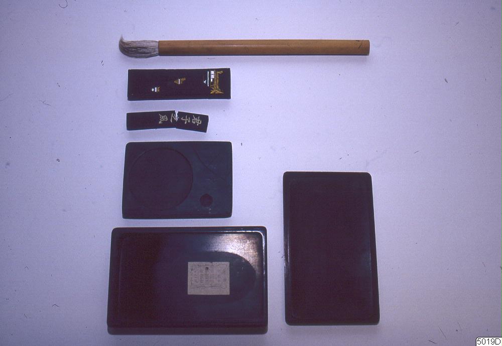 • Skrivställ med tillbehör; pensel och tuschkakor. GEM 1914 a-c. Rivsten för tusch GEM 1914 f. Rivsten för tusch med trälock GEM 1914 e.