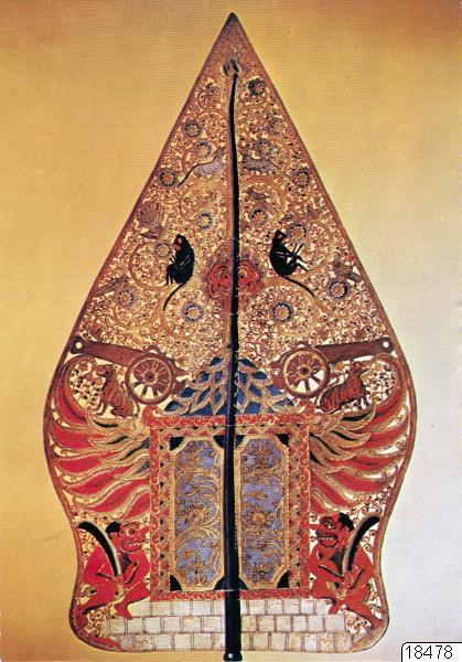 Skuggspelsfigur, "gunungan", som inleder och avskutar ett skuggspelsskådespel. Mått: höjd 30 in (76 cm) Foto av British Museum Erh. till arkivet Dato 1-12-72 Publ. som vykort vid British Muesum