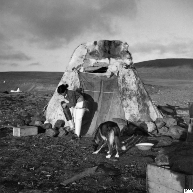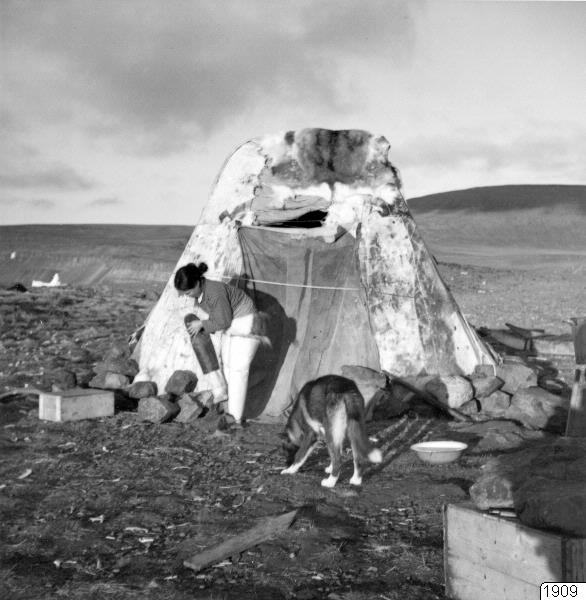 Grönland.Stam: Eskimåer.Motiv: Sommartält. Kvinna mjukar upp ett par stövlar.Foto: ? Dato: ?Erh av: Chr. Luckmann, Göteborg. Dato: 1936-12-18.