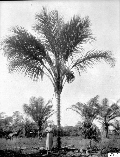 Missions:stn. Cavinas, nära Rio Beni, Bolivia. Från cavinas omgivningar. Kvinnan på bilden Olga Nordenskiöld. Fotot fotograferades under expedition 1913-1914 och erhållit av Erland Nordenskiöld. Se Nordenskiöld: Forskningar och äventyr. Stockholm 1915, bild 218. (Katalogkort)