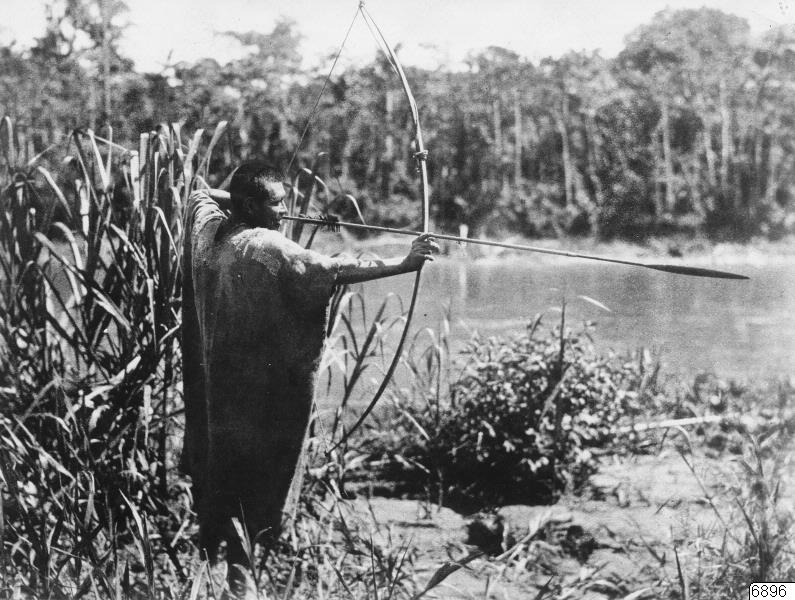 Östra Bolivia. Chimaneindian skjuter med pil och båge. Pilspetsen är av bambu. Avfoto efter Gerstmann. Fotot publicerats i Rob. Gerstmann: Bolivia. Paris 1928, sid 38. Foto erhållit genom köp av fotografen G. Ljungh i Göteborg, omkr. 1930. (Katalogkort)