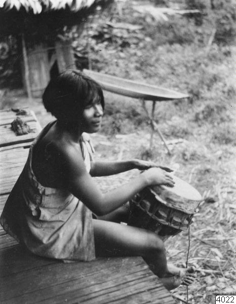 Indian slår på trumma. Använder ej trumpinnar. Trumman post postkolumbisk, vilket även framgår av den från spanskan lånade benämningen "tambora". Erh: från Erland Nordenskiöld 1928. Nordenskiöld: Indianerna på Panamanäset. Stockholm 1928, bild 83. (katalogkort)