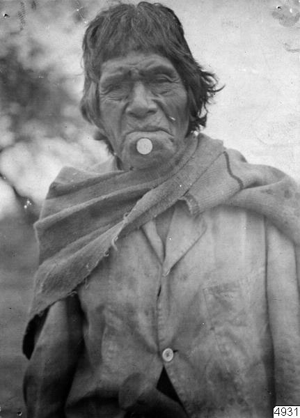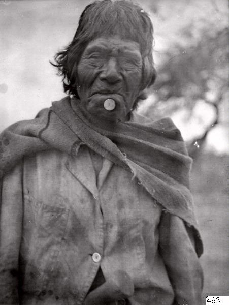 Gubbe med läppknapp (tembeta). Publ. Nordenskiöld: Indianlif. Stockholm 1910, fig.79. Missionsstation Tihuipa, v.Chaco, Bolivia. (katalogkort)