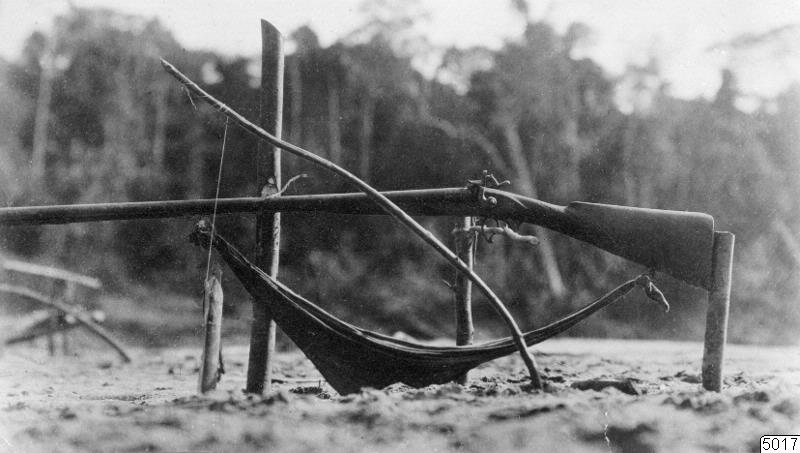• Motiv: Gillrad bössa. Tråden som är spänd över stigen syns ej på bilden. Lokal: Missions:stn. Cavinas, nära R. Beni, Bolivia. Stam: Cavina. Foto taget av Erland Nordenskiöld, exp. 1913-14, erhållet av dito, datum okänd. Publ. Nordenskiöld: Forskningar och äventyr. Sthlm. 1915, bild 239. (katalogkort)