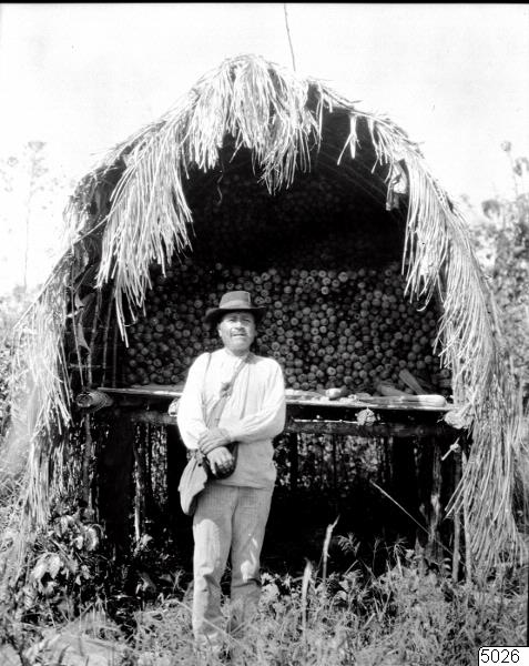 • Motiv: C. Indianen Salvador framför sin majslada. Missions:stn. Cavinas, nära R. Beni, Bolivia. Foto: Erland Nordenskiöld exp. 1913-14. Erhållen av dito, datum okänd. Publ. Nordenskiöld: Forskningar och äventyr. Sthlm. 1915, bild 238. (katalogkort).