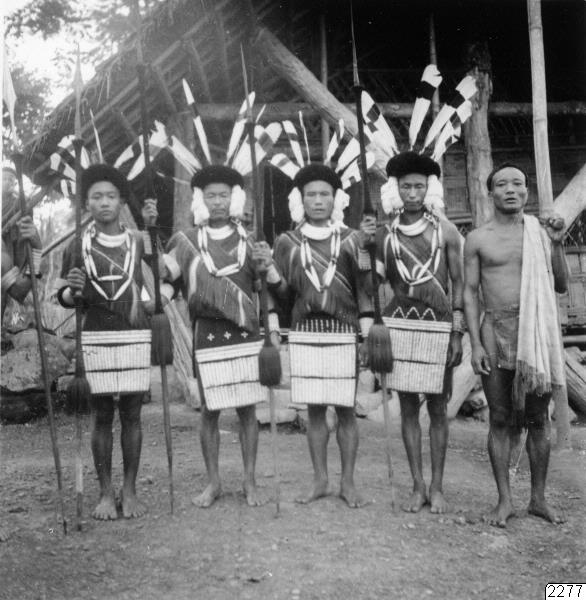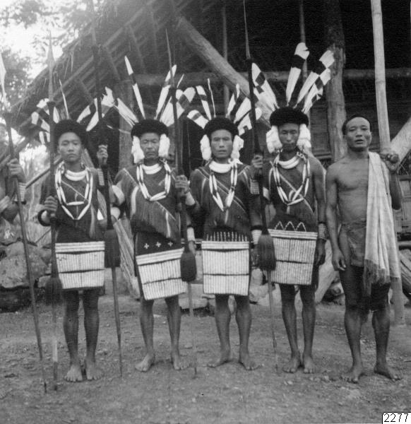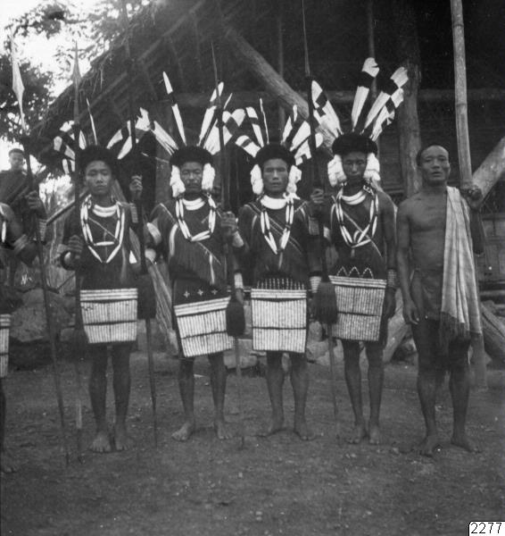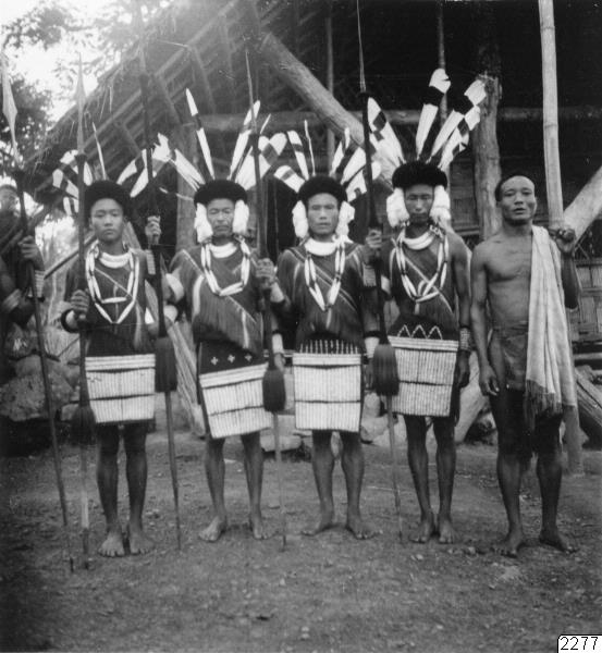 Impur, Naga Hills, söder om Dikhufloden, Assam. Ao-krigare färdiga till strid eller - dans. Fotot erhållit som kopia enligt Westerlunds Negativ. Jfr. Per Westerlund: "Under den röda mantelns skydd", Stockholm 1939, bild vid sid. 113. (Katalogkort)