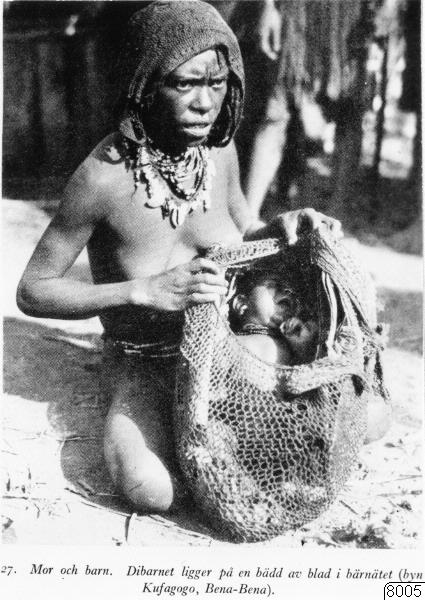 Motiv: Kvinna med ett dibarn, vilket ligger på en bädd av blad i ett bärnät. Lokal: Byn Kufagogo, Bena-Bena, Nya Guinea. Foto: B. Thörnborg, 1943. Erh: på avd:s beställning, 1943. Publ. H.A. Bernazik: Resa i Söderhavet. Stockholm 1935, bild 27. (katalogkort)