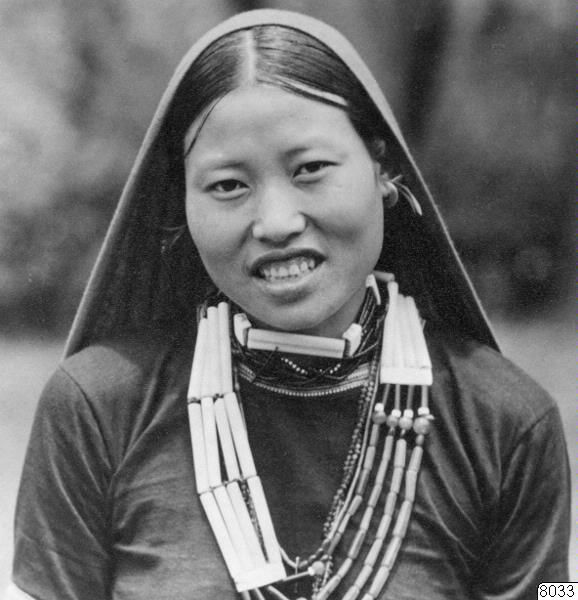 Motiv: Elinai, en Lhota-Naga kvinna. Blus och huvudduk av europeisktindiskt fabrikat. Om halsen bär hon Lhota-Nagas kvinnoprydnad. de små svarta pärlorna äro av kvinnorna slipade frön av vildbananen. Lokal: Wokha, Naga Hills District, Assam. Stam: Lhota-Naga. Foto: Dr. K.E. Kauffmann (Schweiz), exp. 1943. Erh: av dito enligt brev av, 18.8.1943. (katalogkort)