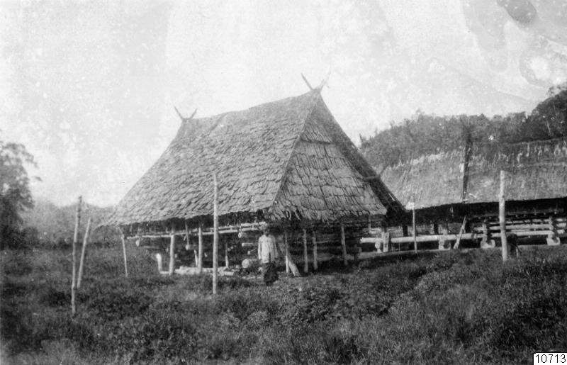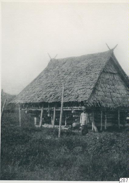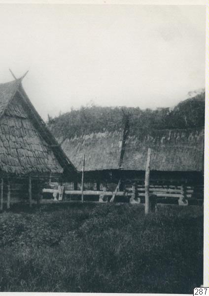 Motiv: Templet, lobo, i byn Longko. Jfr. bildnr. 287=först. av samma motiv. Lokal: Lindoe, Central-Celebes (Mellan-Celebes, Paloe). Foto: Walter Kaudern, 1919. Erh.: gm. köp av Kauderns negativmaterial, 1947. (katalogkort).