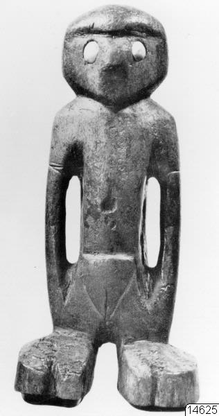 Motiv: Träfigur,kvinna,ögon av snäckskal, höjd 14 1/2 ", Möjligen från Ellice-öarna. Raymond Wielgus samling. Lokal: Mikronesien. Avfoto av: J. O. Brändström. Dato: 18/3 1961. Nr. Neg. 9057. Publ.: The Raymond Wielgus Collection, The Museum of Primitive Art. Fig. 25. New York 1960. (katalogkort)