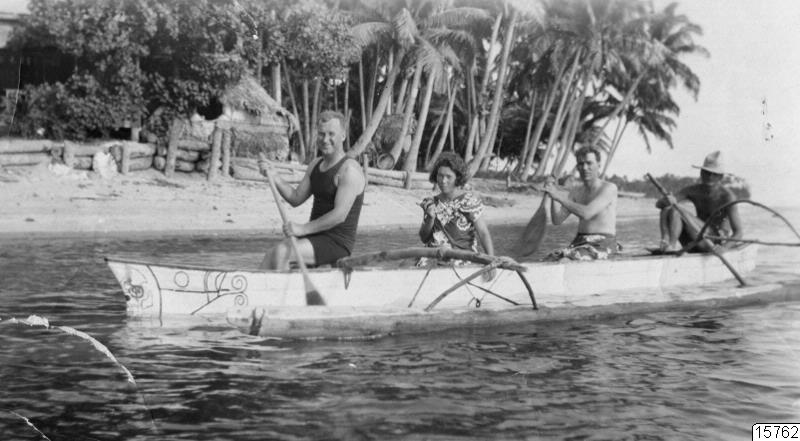 "Fröken Fridner i söderhavsdräkt tillsammans med två europeer och en inföding från Samoa på paddeltur i en infödingskanot. Samt ett foto med kanoten och männen. Båda fotografierna i löjtnant Yngve Olssons kvarlåtenskap. Denne hade vistats på Tahiti. Gåva genom systern fröken Ingegerd Olsson. (katalogkort)
