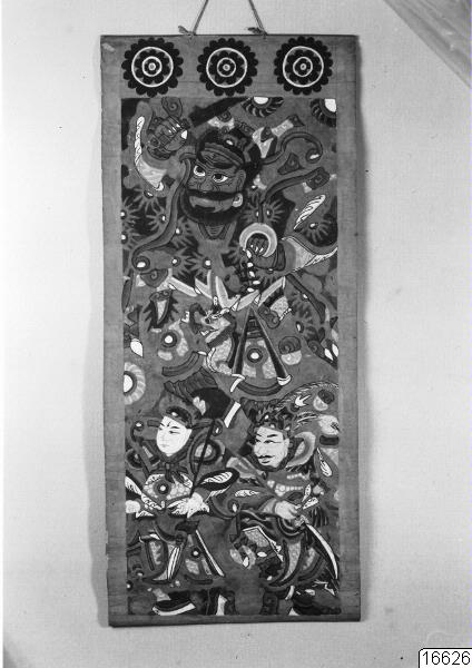 • Rituell målning på papper. 102 x 43 cm. Yao-Taoistisk. Målad i Mung Sing, norra Laos, omkring 1880 av kinesisk specialist (naturaliserad yao). GEM 67.7.6. Thailand: Chiengrai-provinsen: Maechan. Foto: J.O. Brändström 1967. Erh: Ingen uppgift. (katalogkort).