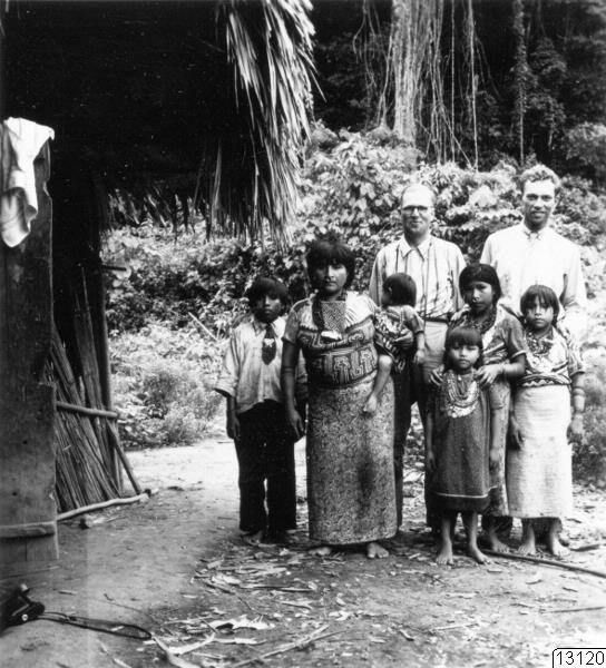 Henry Wassén, Nils M. Holmer samt hustrun till förste hövdingen Manitinali med hövdingafamiljens barn. Hon hette Manibdigili. Skiopt.: 1095 Kliché: 3445 Publ.: Henry Wassén: Contributions to Cuna Ethnography. Etnologiska Studier 16, Gbg. 1949, fig. 8. (Katalogkort)