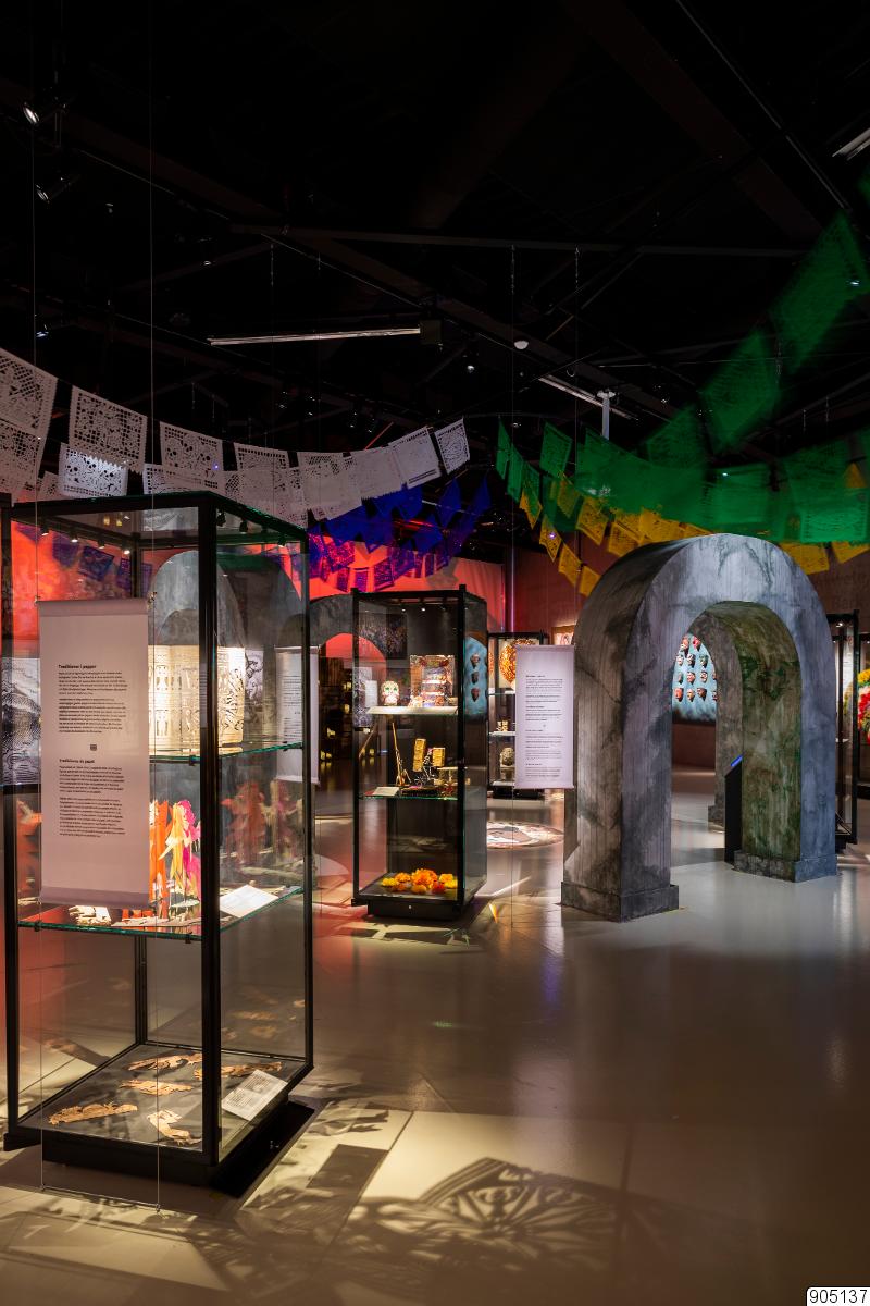 Utställningen Viva Mexico på Världskulturmuseet. Till höger skymtar 1937.19.0139, den fjäderprydnad/dansattribut från Etnografiska museet som varit utställd i "Tillsammans" sedan 2015 men som tillfälligt ställdes ut i Viva Mexico.