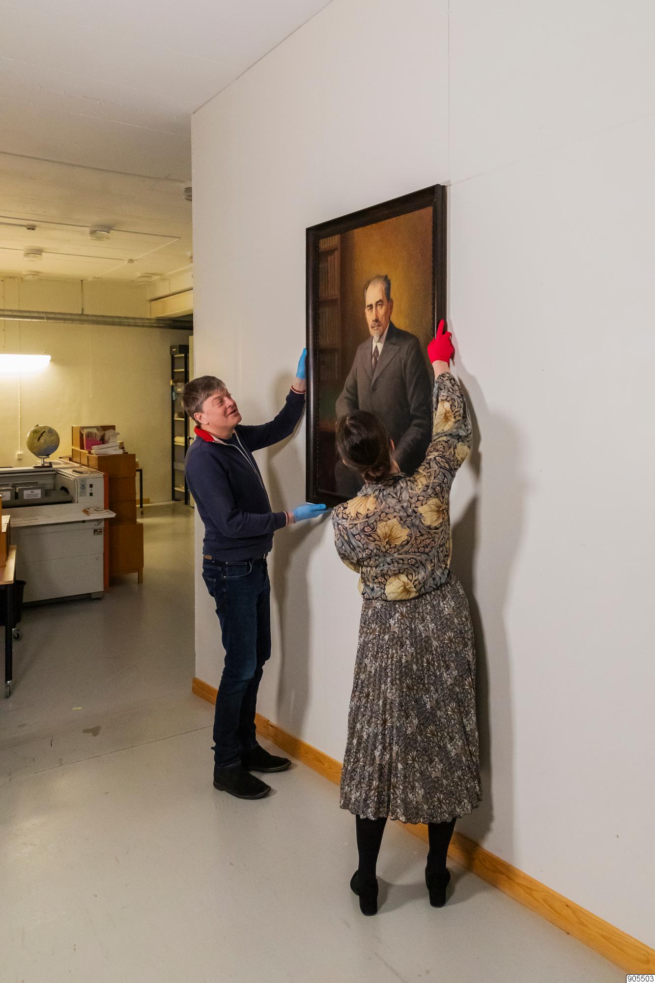 • (Namn dolt) och Kristofer tar ner tavlor ifrån väggen i arkivet på Ebbe (Ebbe Lieberathsgatan), Världskulturmuseet.