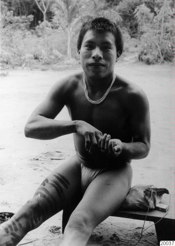 • Ung man målar sig med röd växtfärg - carayuru (ngunami). (Jämför med bild 020026)