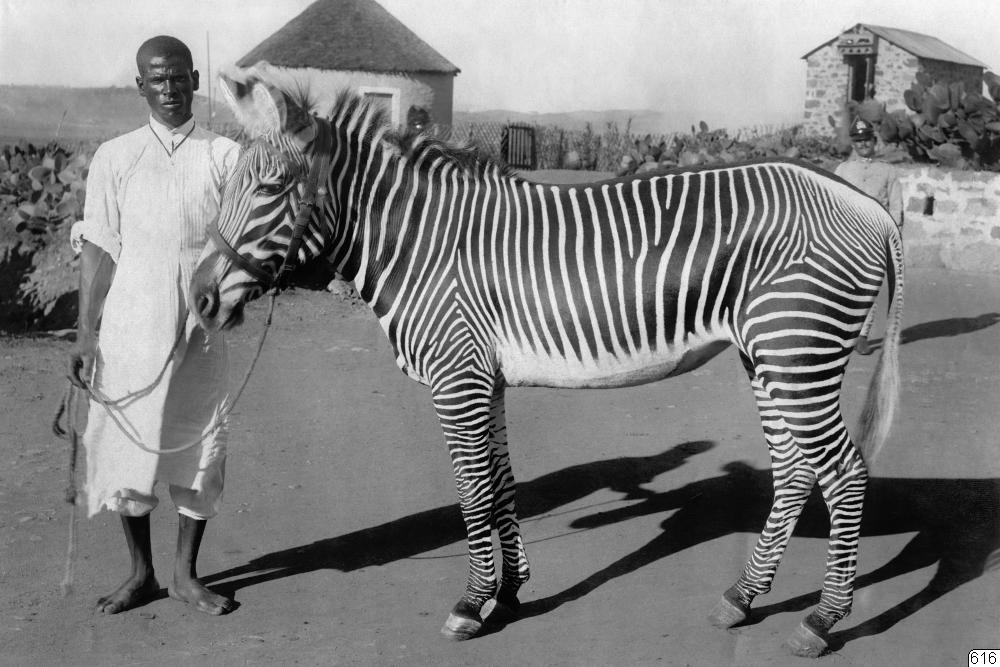 En Grevy-zebra visas här upp av en för oss okänd man. Bilden är från Asmara, huvudstaden i Eritrea. Under lång tid hade denna zebratyp hög status och stor betydelse för diplomatiska förbindelser och internationella kontakter. Den är uppkallad efter den franske presidenten Jules Grévy som år 1882 fick en zebra av Abessiniens regering. Ett antal år senare fick även USA:s president Roosevelt en zebrahingst som fick namnet Dan. Det är okänt vilket år bilden är tagen, men fotografiet köptes av museet från grosshandlare Oscar A. Hagberg från Göteborg. Under en resa till Egypten 1908 blev Hagberg på båten från Genoa till Alexandria god vän med en tysk termitforskare som övertalade honom att följa med till Abessinien. Där kom han i kontakt med en skandinavisk missionsstation. Hagberg gav i uppdrag åt den svenske missionären Jonas Iwarsson att samla in lokala föremål och fotografier till museet i Göteborg. Fotografierna i denna samling är från flera platser i de områden som var ockuperade av Italien mellan 1889 och 1941. Fotografen Luigi Naretti var en professionell fotograf utsänd av den italienska kolonialmakten. (Ögonblickar 2013, utställningstext)
