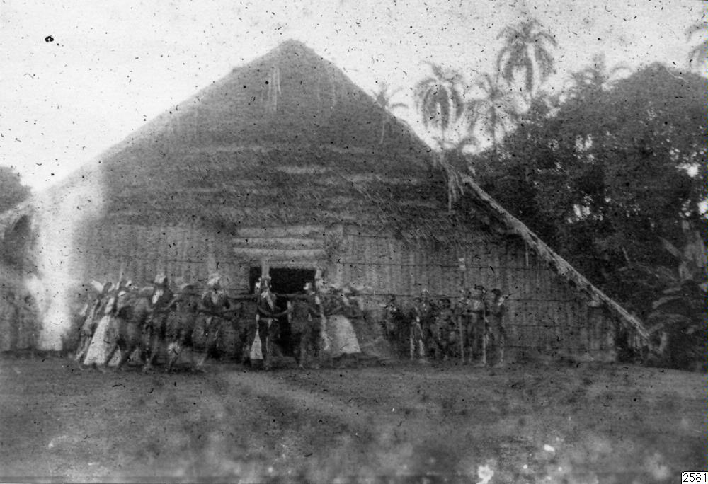 Motiv: Dans framför en maloca (stor-hydda).Lokal: Urubuquára, Uaupés, NV.Brasilien.Stam: Tariána.Foto av: Curt Nimuendajú. Dato: 1927.Erh.: med saml.28.1. Dato: 1928.(katalogkort)