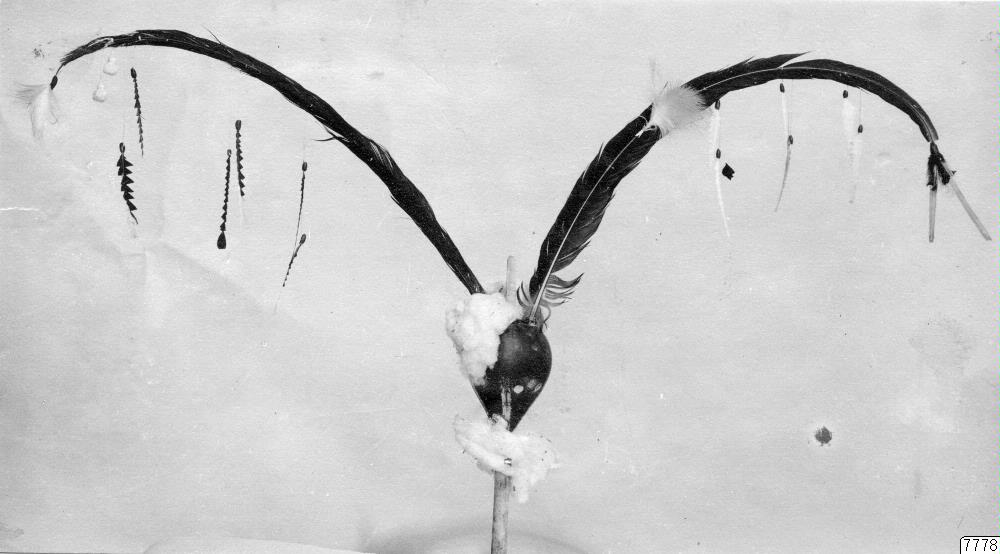 Motiv: Dansskallra med fjädrar fäst på festmasten. Kat. nr. 26.3.231. Lokal: Bras. Guyana. Stam: Palikur. Foto av: G. Ljungh. Dato: ? Erh.: på avd:s beställning. Dato: ? Nr. Neg.: 3116. Publ. Curt Nimuendajú: Die Palikur-Indianer und ihre Nachbarn. Göteborg 1926. fig. 37. (katalogkort)