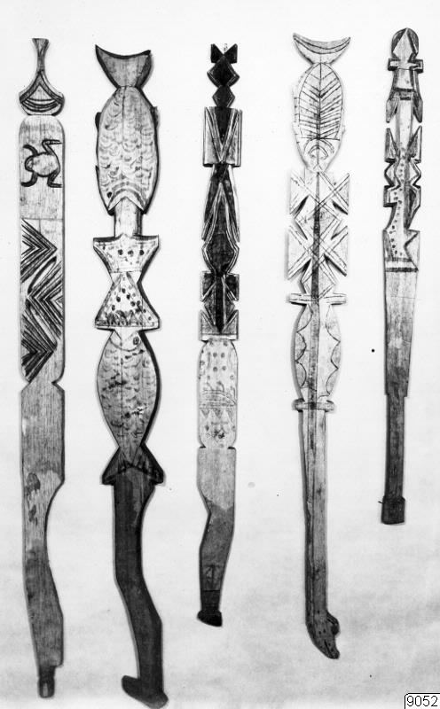 Motiv: Stavar som under maskdanserna bäras över vänstra skuldran. Kat. nr. 30.40.140-143 samt 145. Lokal: Brasilien. Stam: Tukuna. Foto av: G. Ljungh. Dato: 1931. Erh.: på avd:s beställning. Dato: kop. 1943. Nr. Neg.: 4542. Kliché: 1168 och 651. Publ. Göteborgs Musei Årstryck 1931, fig. 5 i etn. avd:s berättelse. Nr. 141 publ. av H. Wassén: The Frog-Motive etc. Antrophos, t. XXIX, 1934, fig. 10. ...