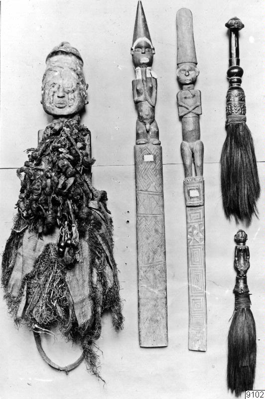 Motiv: Träskulpturer, fetischer.Lokal: Kongo, Afrika.Foto av: ? Dato: 1911.Erh.: på avd:s beställning. Dato: kop. 1943.Nr. Neg.: 4654.Kliché: 1074.Publ. Årstrycket 1911, sid. 61.(katalogkort)