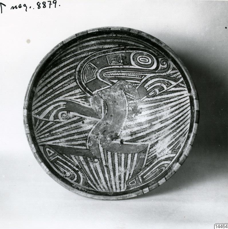 Motiv: Detaljbild av skålens översida på lerkärlet 58.31.3. Motiv: "den dansande krokodilguden". Jämför bildark 14451 med annan bild av samma kärl (neg. 8847). Lokal: La Peña, V. till NV. om Santaiago de Veraguas, Panama. Stam: /arkeologi/ Foto av: Olof Brändström. Dato: aug. 1959. Erh.: till arkivet. Dato: 31.8.1959. Nr. Neg.: 8879. Publ. fig. 11 a' (?) i Henry Wassén: "A Find of Coclé-Style Pot...