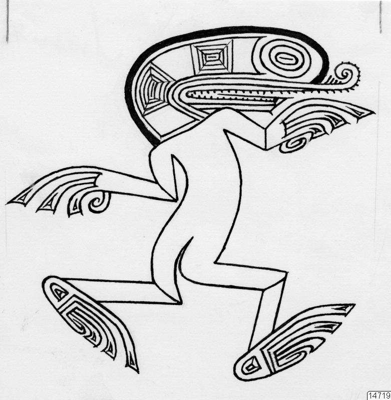 • Motiv: Av herr Otto Puusta utförd teckning av motivet "dansande krokodilguden" på keramikskålen 58.31.3. från La Peña, Veraguas (se fig. 11 i H. Wassén: "A Find of Coclé-Style Pottery in a Single Veraguas Grave, Panama" i Årtrycket 1957-1958, där teckningen användes för klichén till omslaget på Årstrycket).