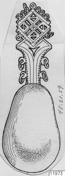 • Föremål ur samling köpt från hr Edvard Hallins sterbhus, Borås. Kat.nr. 48.21.39, sked, snidade av mästaren Jon Pålsson Fanki från Gellivare Sn.