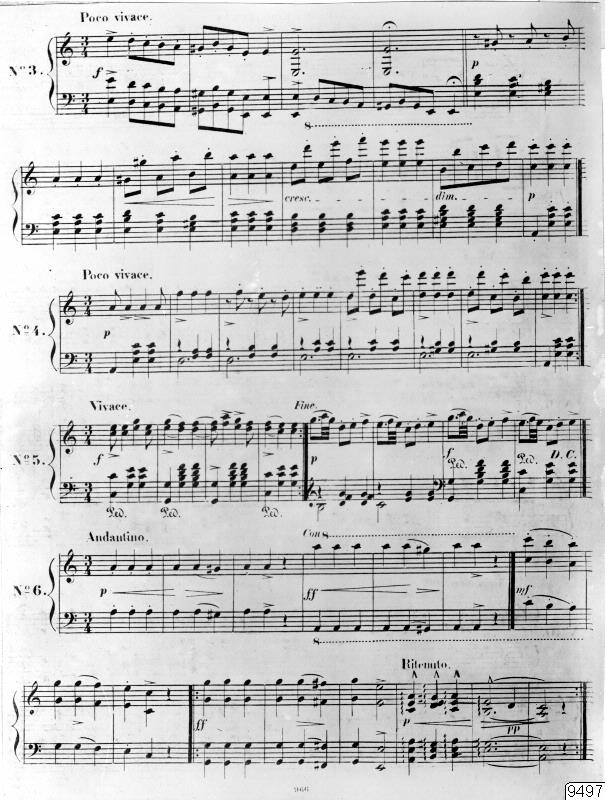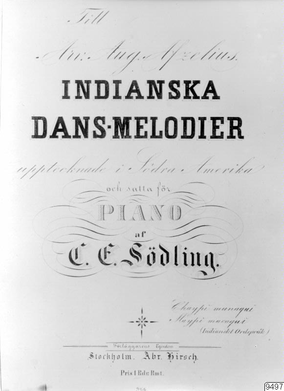 Fotokopior av Söderlings "Indianska Dansmelodier" etc. Uppt. i S.Amerika där Södling vistades 1850-58. Titelblad samt mel. 1-6 = 3 fotos. Forts.mel.7-13 på kop.9498.