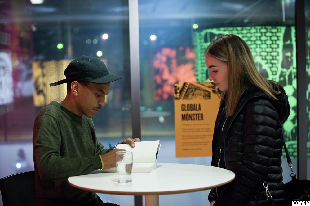 Jason ”Timbuktu” Diakité i samtal med Lovisa Fhager Havdelin om sin nya bok En droppe midnatt på Världskulturmuseet i Göteborg 25.01.2017. Kvällen arrangerades av Anna Lindh-stiftelsens nätverk i Sverige och Teskedsorden