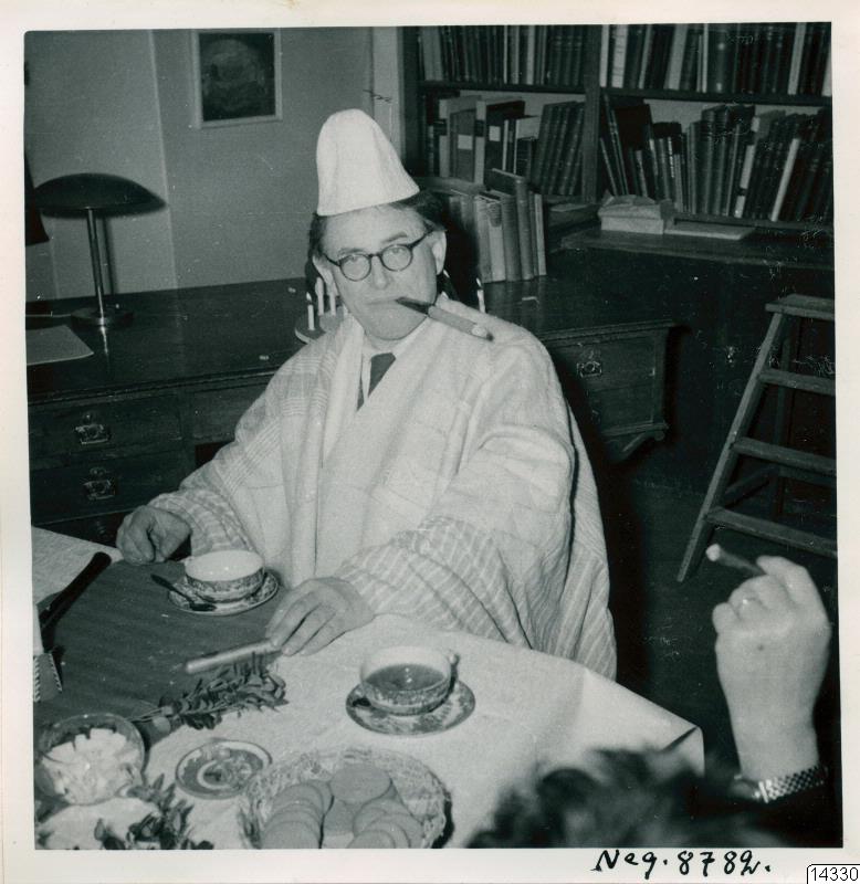 Lucia, då Brändström uppträdde förklädd till Haussa-man och bar en rymdstationsmodell på huvudet och en stor festcigarr i truten. Konservator Thörnborgs strävhåriga tax agerade sputnikhund. Om bakgrunden se dåtida press. Lokal: Etnografiska museets bibliotek